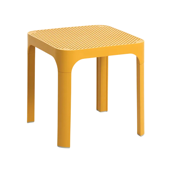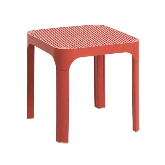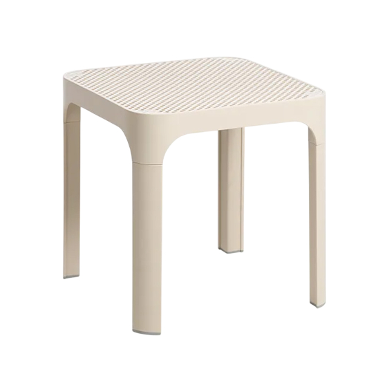 Mesa baja de jardín en polipropileno con sobre perforado. Dimensiones: 40x40x40h cm.