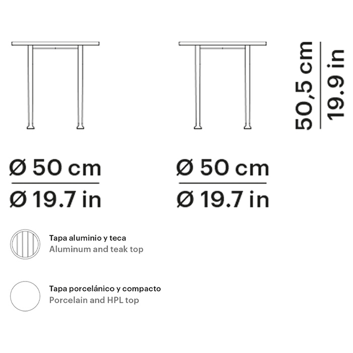 Mesa rincón exterior redonda con sobre HPL o porcelánico. Dimensiones: Ø50x50,5h cm
