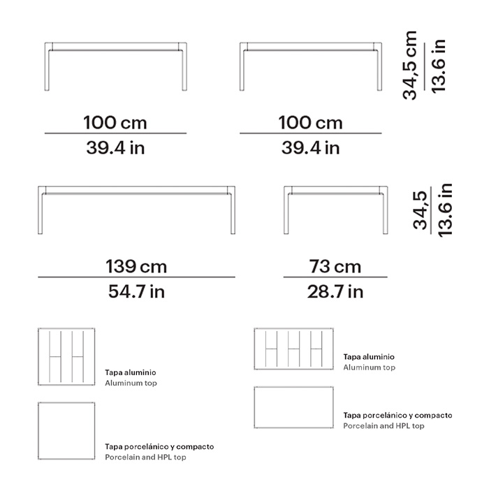 Fabricadas con estructura de aluminio pintado al polvo, disponibles en los acabados Blanco Mineral 34 y Gris 56. Ambas incorporan tapa a elección en aluminio, porcelánico o compacto.