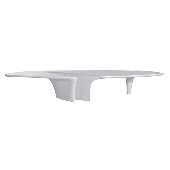 El resultado es la mesa de centro Waterfall de Driade con una forma completamente nueva forma, marcada por una importante, y expresionista, depresión en el centro de la parte superior.