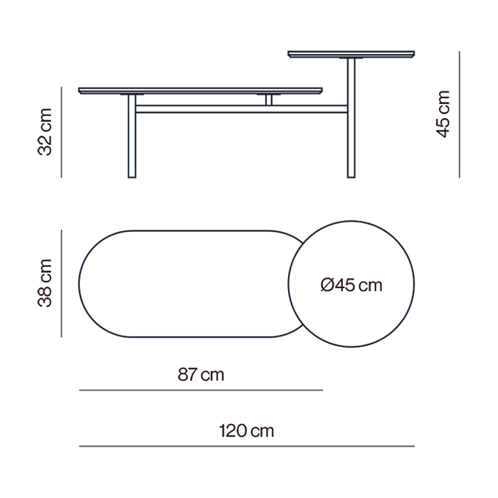La mesa de centro parte de una estructura metálica tubular que genera dos alturas, aportando dinamismo visual y practicidad. Está disponible en una amplia variedad de acabados para la tapa, como nogal, roble o laca, lo que facilita su integración en hogares, hoteles, oficinas y otros entornos contract.