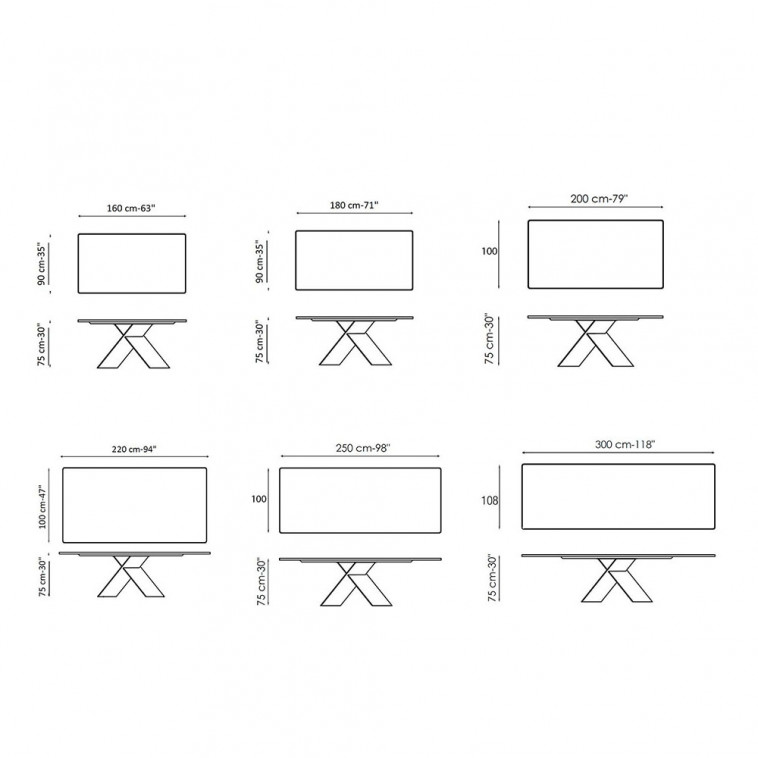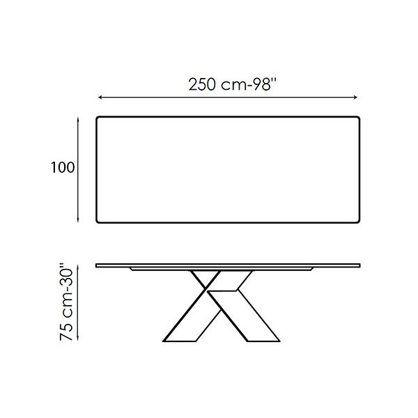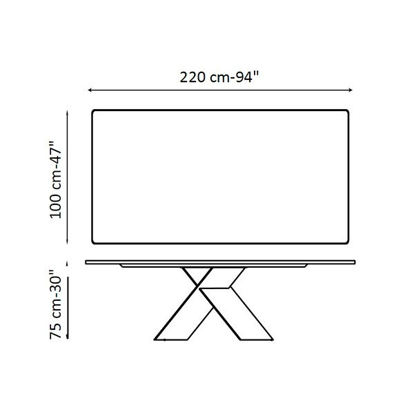 Mesa fija rectangular con sobre de cerámica en base de acero cruzada.