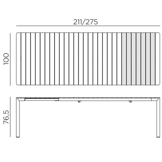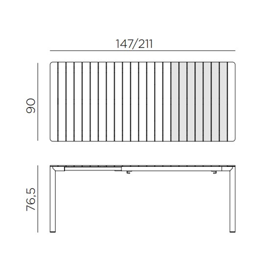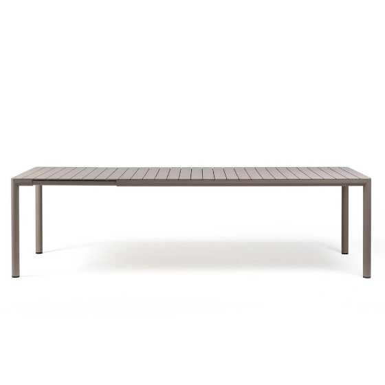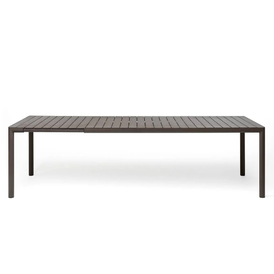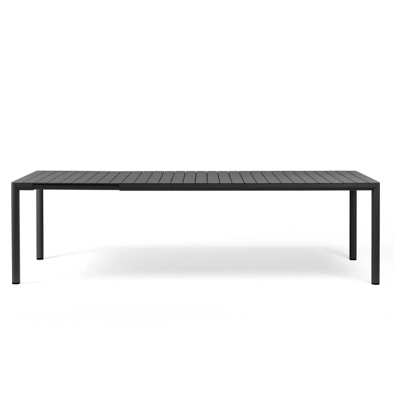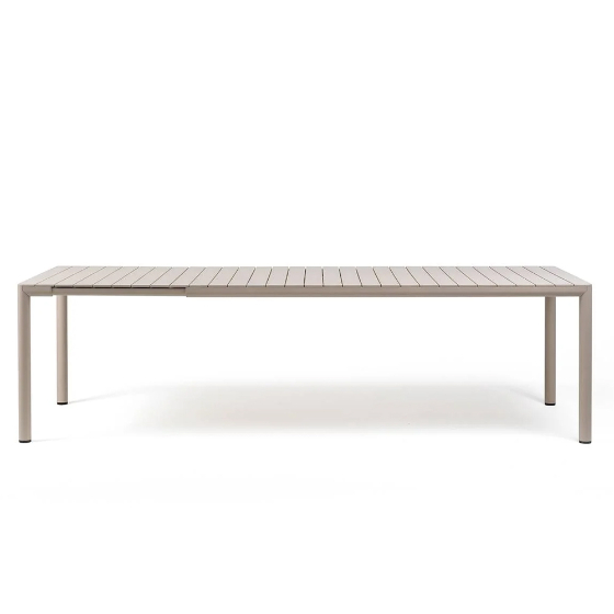 Mesa extensible de exterior con un diseño suave y sin esquinas. Hecha de tablero de polipropileno fiberglass tratado anti-UV y teñido en masa, con estructura de aluminio pintado de efecto mate.
