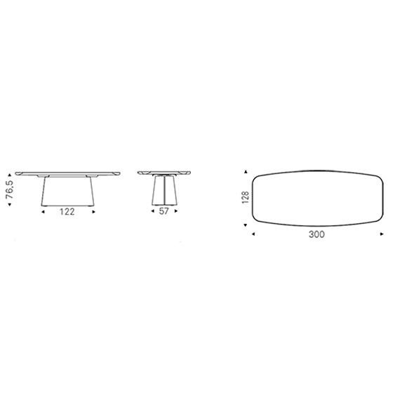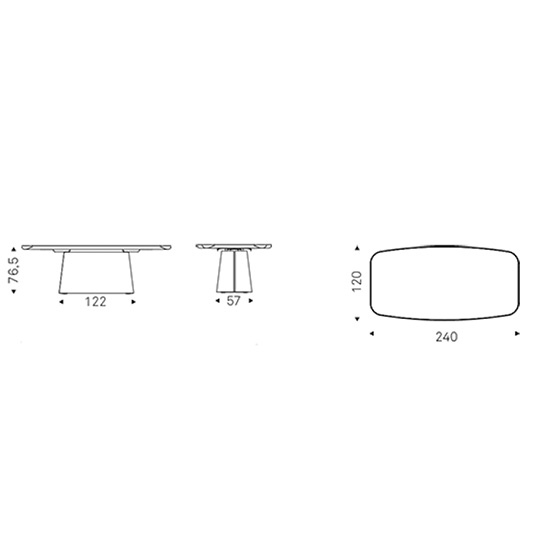 En las mesas con base central Napoleon se unen dos cascos perfectamente simétricos. Un detalle resalta en el lado estrecho de la base: la gola vertical entrante, revestida en cerámica, que aporta un contraste a la superficie que, de otro modo, parecería homogénea.