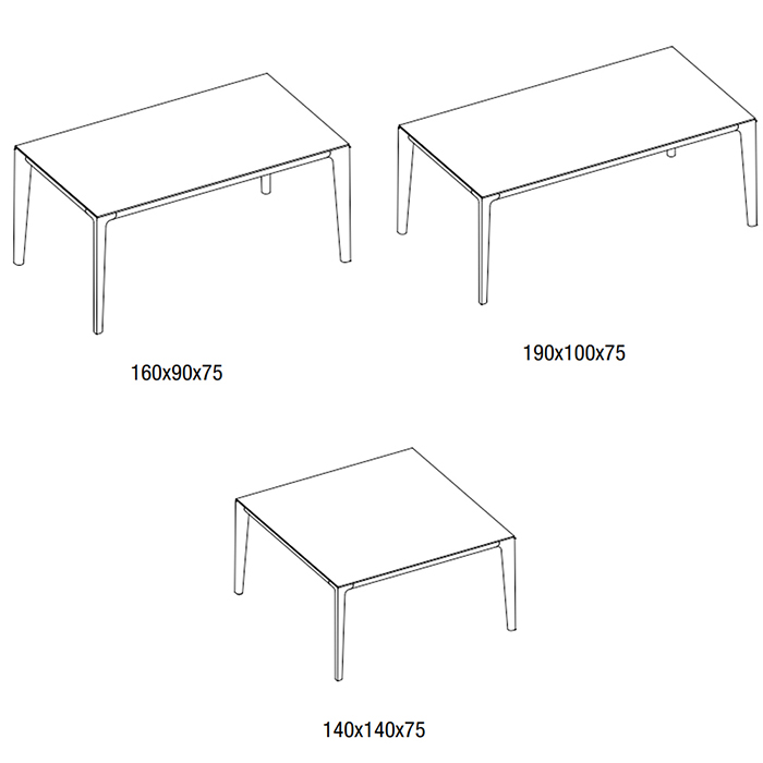 Mesa cuadrada y rectangular, fija con estructura de acero lacado. Con sobre de SuperCerámica y SuperMármol.
