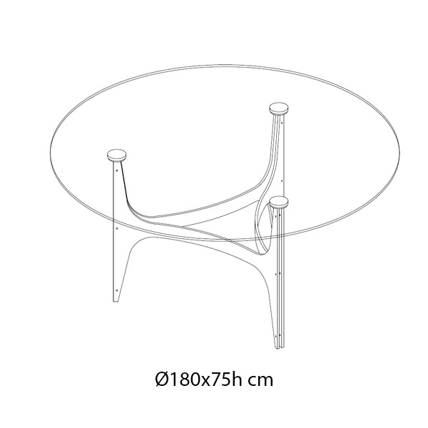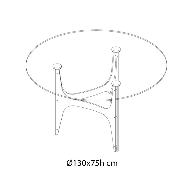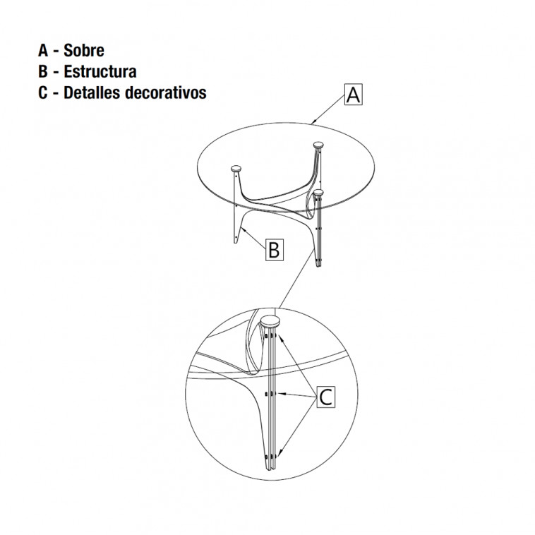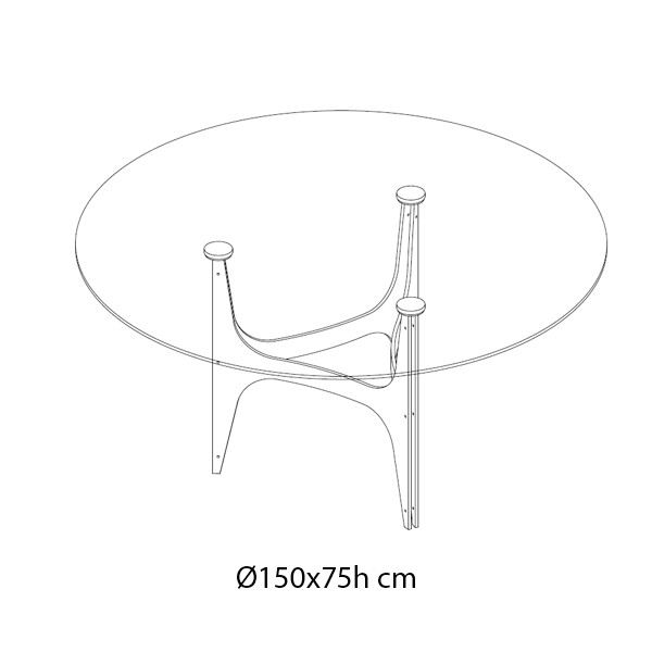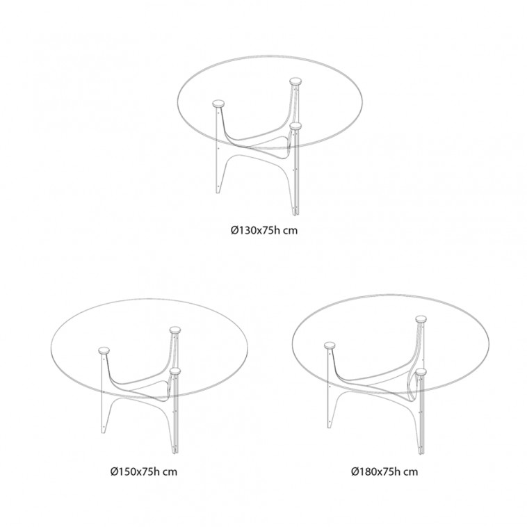 Mesa redonda fija con estructura y detalles decorativos de acero y sobre de cristal.