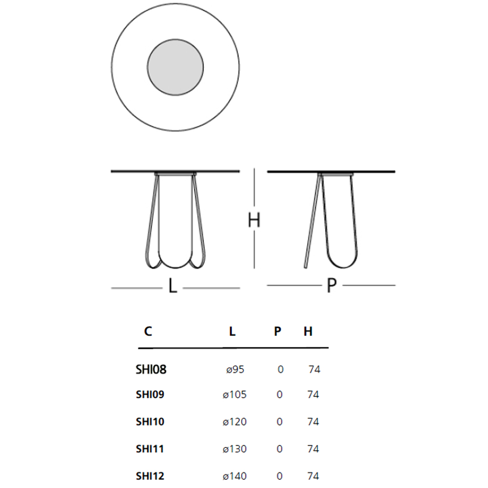 Mesa redonda Shimmer diseñada por Patricia Urquiola. Esta mesa están fabricadas con cristal estratificado y encolado, con un acabado especial multicromático tornasolado que cambia de color según el ángulo de la luz y el punto de vista. Esto las convierte en objetos con un aspecto mágico y etéreo. En las mesas las bases son desmontables y se fijan a los sobres mediante placas metálicas, que están ocultas por decoraciones circulares con un acabado que las cubre.