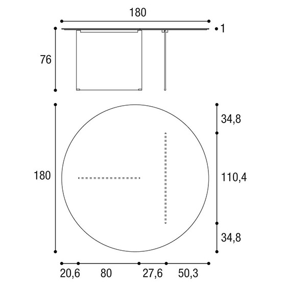 Mesa redonda con tablero de vidrio y patas de cristal. Diseño por Daniele Lago