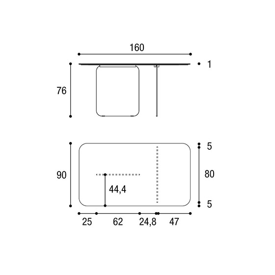 Mesa rectangular con cantos redondeados y tablero de vidrio. Diseño por Daniele Lago