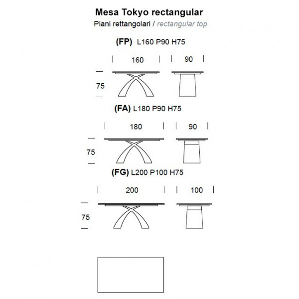 La mesa rectangular fija Tokyo se encuentra disponible en versión fija en tapa de cristal templado y con base de aglomerado, carril gris.