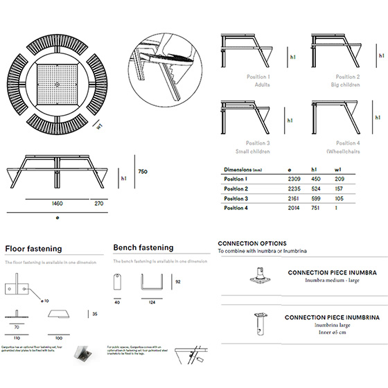 De esta misma funcional parámetro, Gargantúa es una mesa de diseño original con bancos regulables en altura para permitir que los niños se sienten a la misma altura de los ojos como los adultos y para personas con movilidad reducida puedan acceder fácilmente así. Disponible con cojines para los bancos en tela Sunbrella: un tejido acrílico conocido como el mejor tejido de exterior.