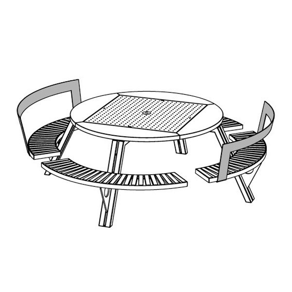 Mesa exterior redonda con bancos madera en acero. Dimensiones: Ø231x75h cm.