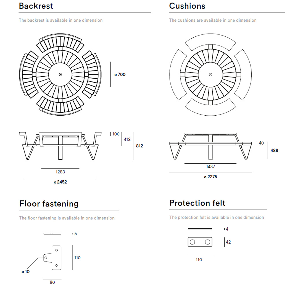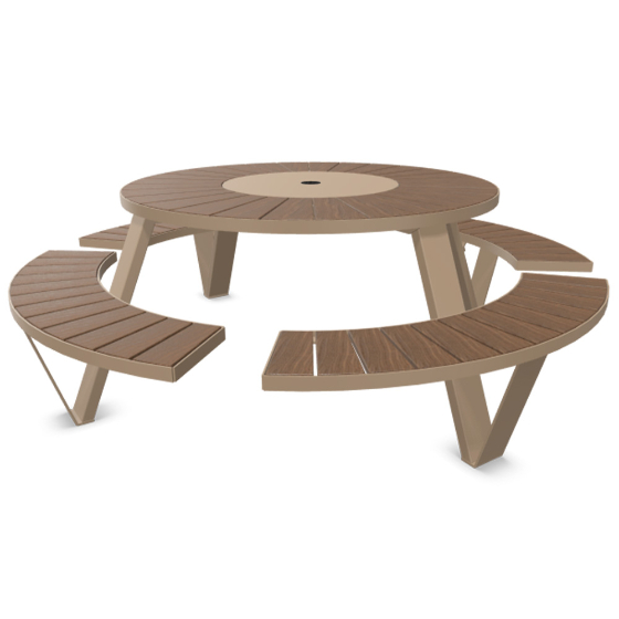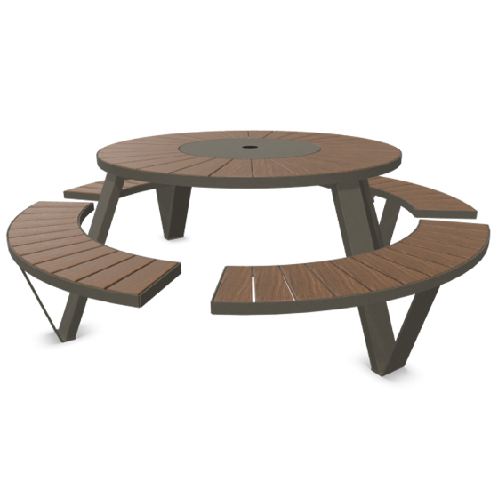 Refinada mesa de picnic redonda. La mesa de picnic redonda Pantagruel tiene capacidad para ocho personas. La estructura está disponible en acabado con recubrimiento de polvo. Cuando se combina con la madera utilizada para el tablero y los bancos, forma un conjunto de picnic duradero para exteriores