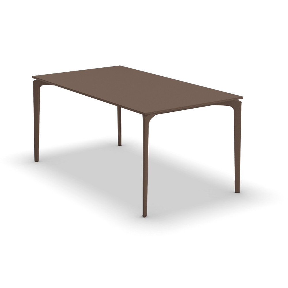 La mesa rectangular de terraza Allsize de Fast se ve resaltado por su tablero de aluminio lacado que descansa sobre una base, creando un estilo geométrico y riguroso.