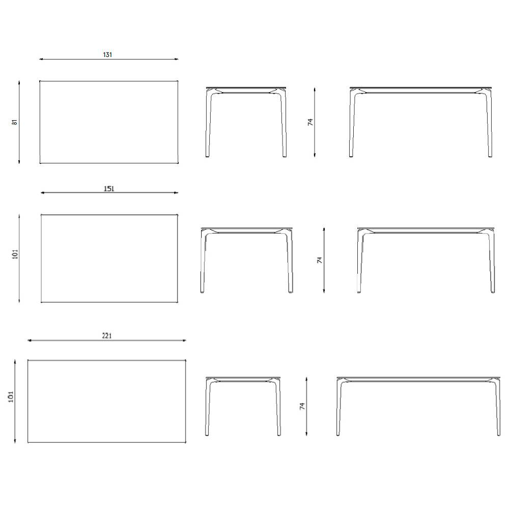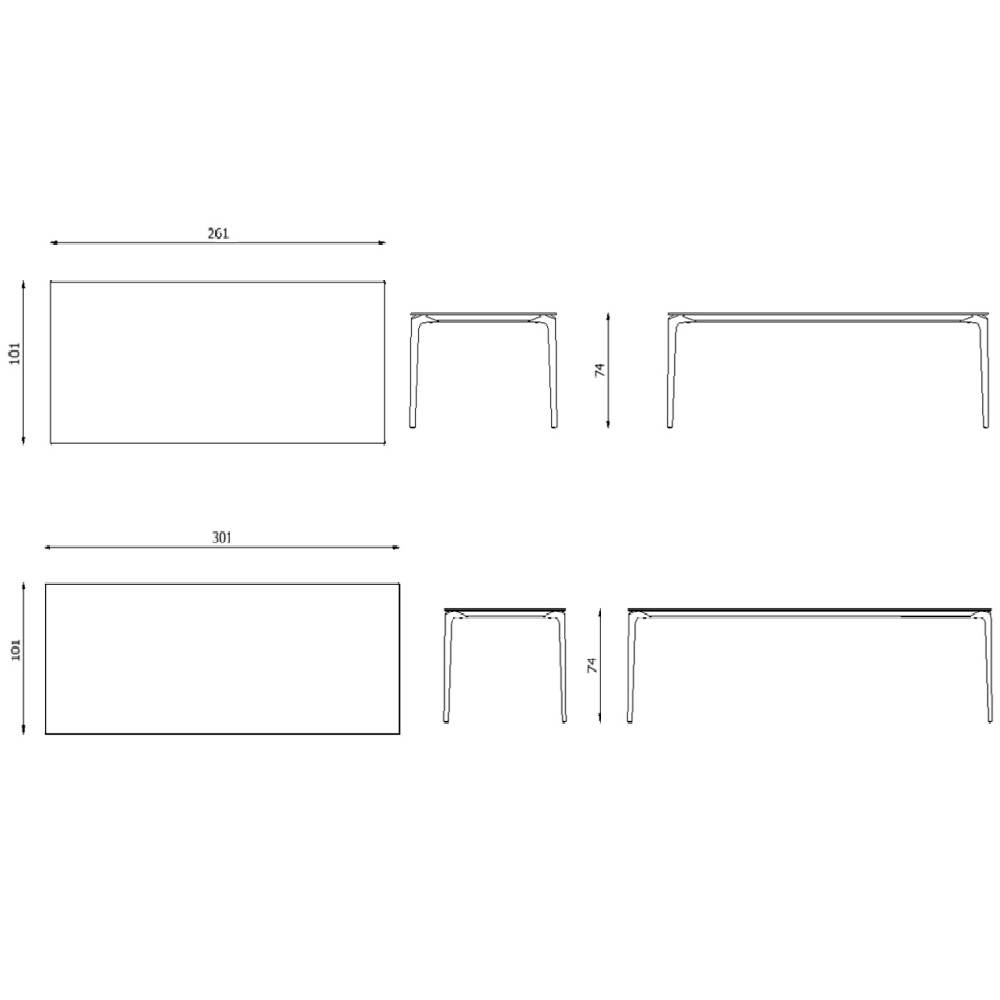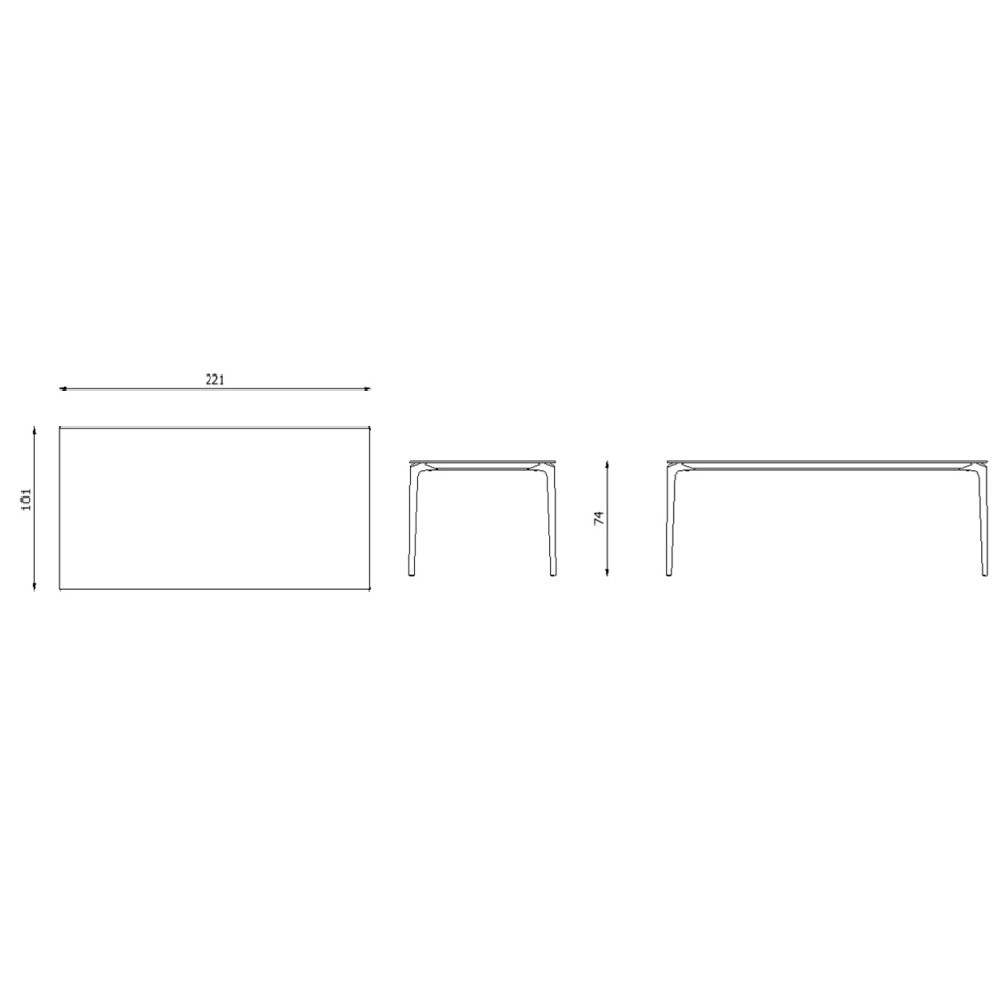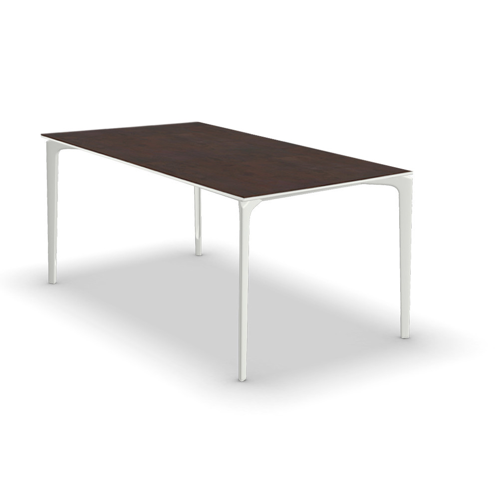 Mesa rectangular con estructura de aluminio lacado y sobre gres porcelánico.