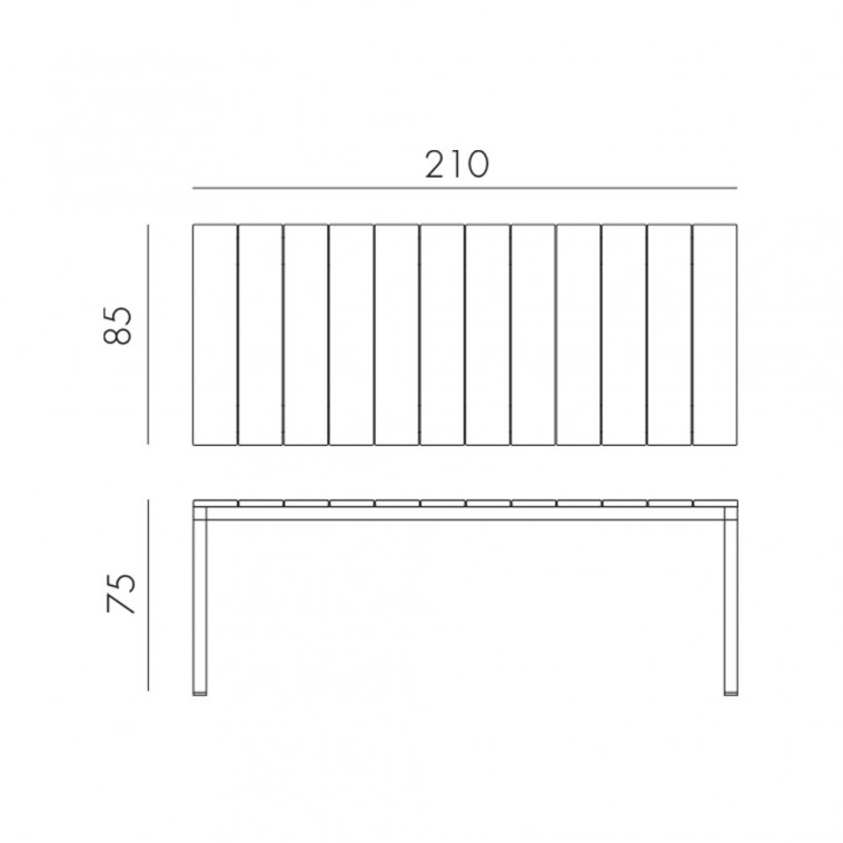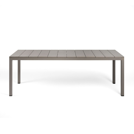Rio Alu Fix es una mesa con tablero de lamas de aluminio pintado con una textura ligeramente rayada y estructura también de aluminio pintado. Una fuerte personalidad con precisos matices arquitectónicos y aspecto texturizado.