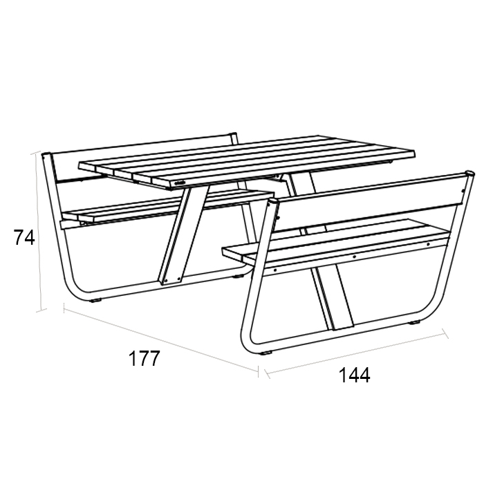 Mesa exterior rectangular con bancos en madera. Dimensiones: 144x177x74h cm.