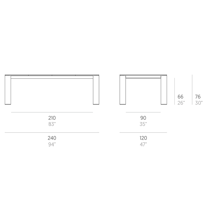 Mesa alta con sobre de porcelánico y estructura de aluminio. Dimensiones: 240x120x76h cm