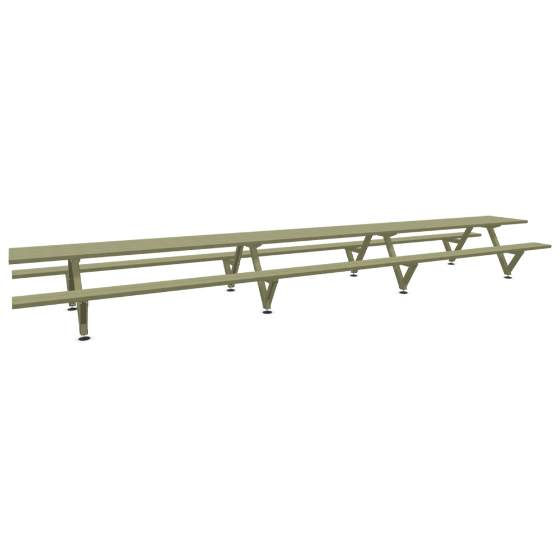 Mesa exterior con 3 pies y bancos a ambos lados en base acero. Diseño Metrica.