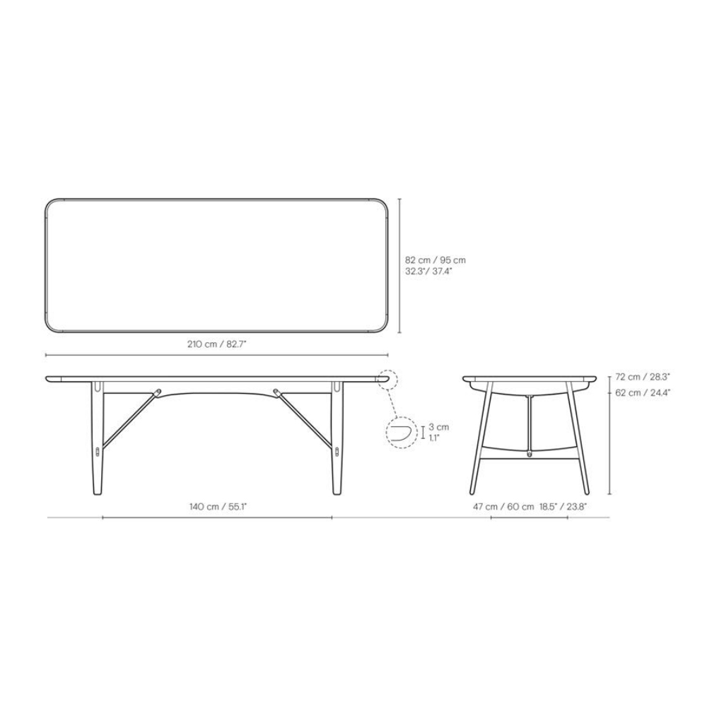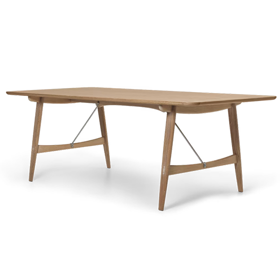Está fabricada para un uso frecuente ya que cuenta con esquinas redondeadas y bordes en madera maciza de roble, nogal o mixto, lo que demuestra la pasión de Mogensen por el diseño democrático y accesible.