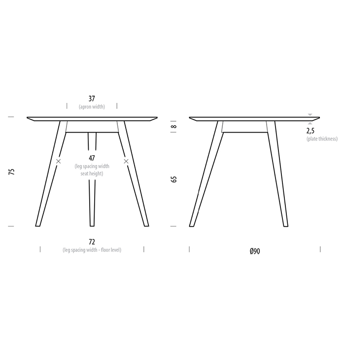 Mesa redonda con estructura de madera maciza de roble. Dimensiones: Ø90x75h cm