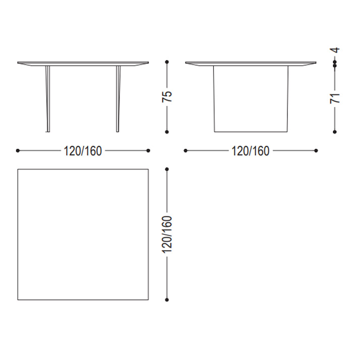 Mesa fabricada íntegramente con listones de madera maciza encolados, con lados rectos y bordes finos en el tablero y las patas. Versión con tablero cuadrado.