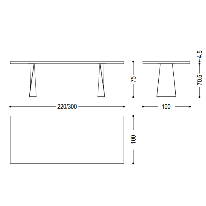 Mesa fabricada con tablero chapado en madera maciza y cantos biselados. Se caracteriza por dos patas de madera maciza con acabado pigmentado.