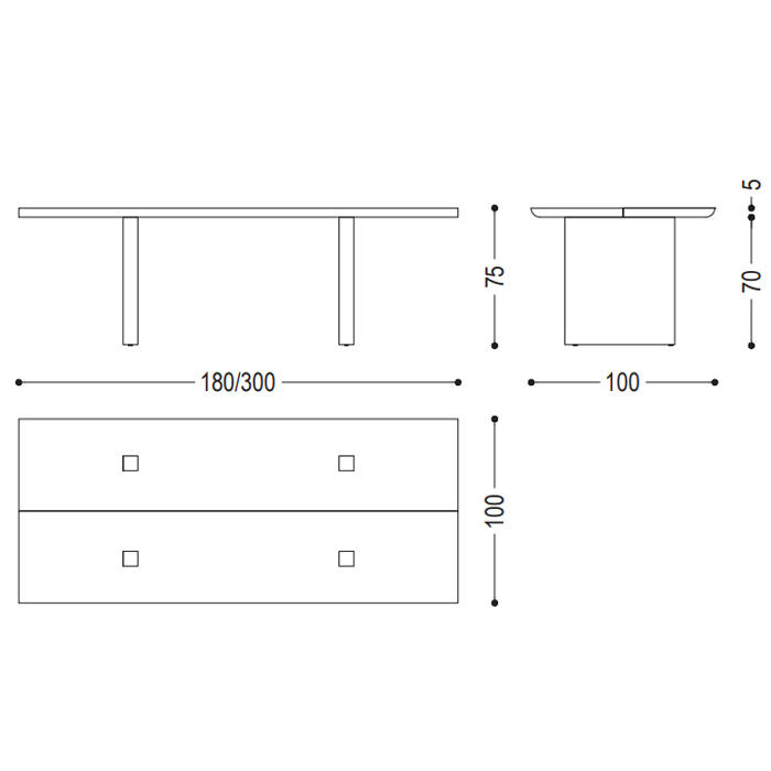 Mesa fabricada íntegramente en madera maciza en listones encolados, con hueco central y patas visibles en el tablero. Disponible con perfil superior recto.