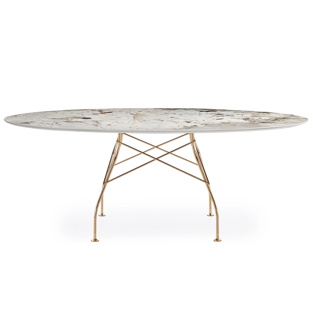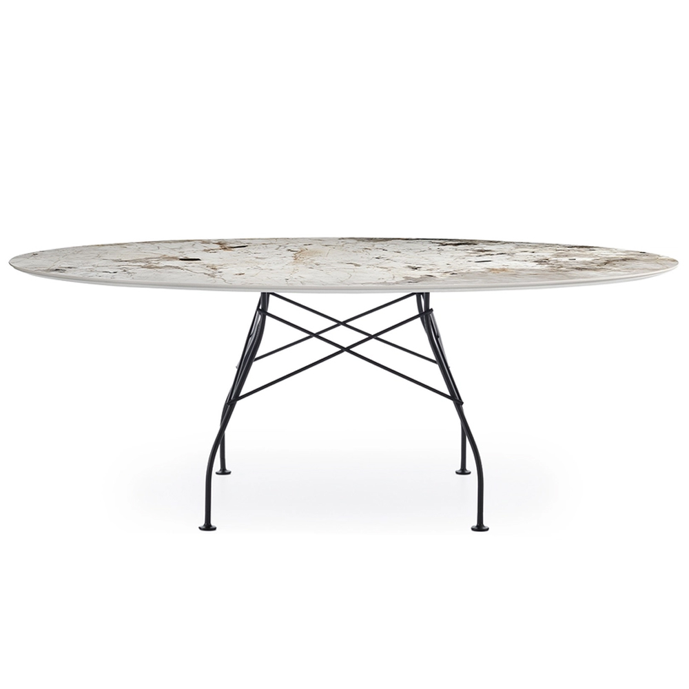 Mesa con sobre ovalado de Gres en acabado de mármol. Dimensiones: 192x118x73h cm.