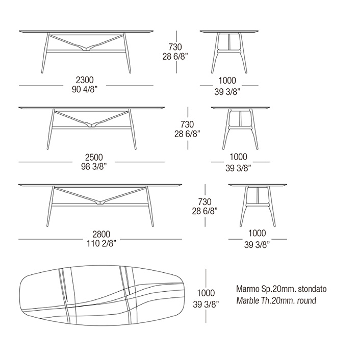 Mesa semiovalada con estructura de madera y sobre de mármol. Diseño F.Laviani.