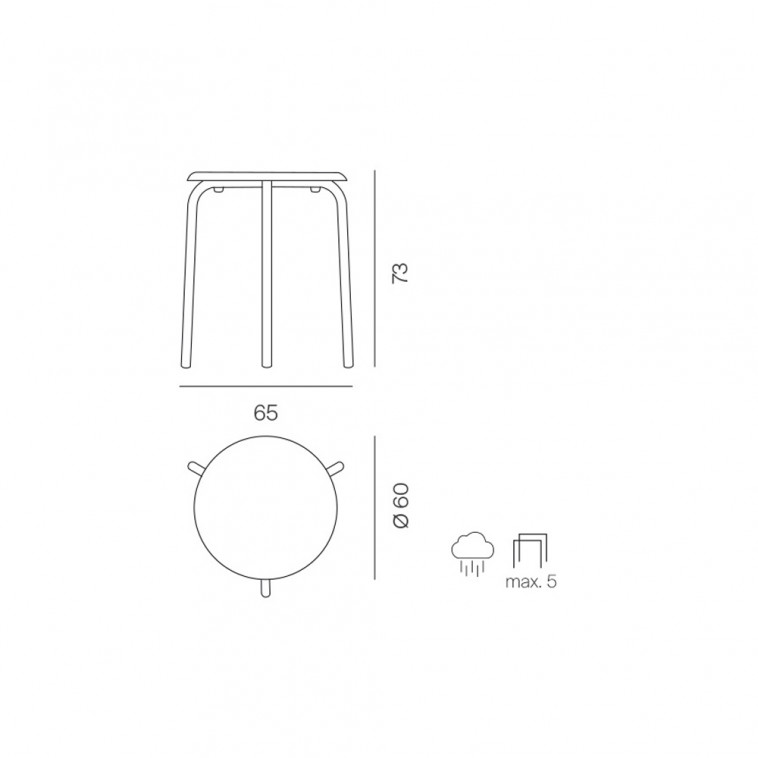 Mesa redonda apilable con estructura de tres pies y sobre de acero. Dimensiones: Ø60x73h cm.