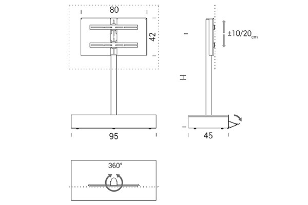 En este moderno mueble de televisión se pueden montar televisiones de 19 a 65 pulgadas y cuenta con una base de acero de 6 mm con patas regulables de acero inoxidable y patines de teflón para colocarla fácilmente.