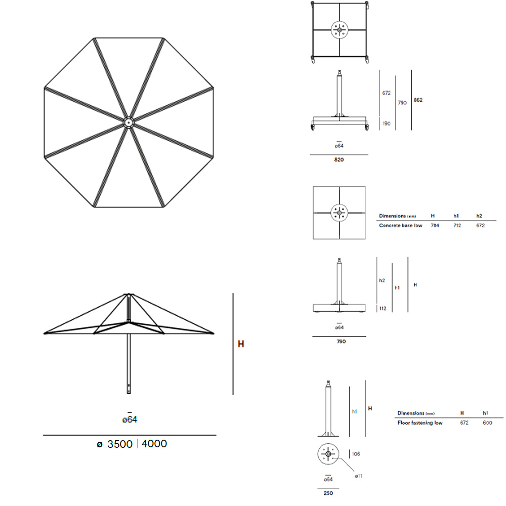 Paraguas de diseño moderno original. ¡Deje que el sol brille! Inumbra ofrece protección con una apariencia minimalista y sin partes técnicas visibles por debajo, dejando una visión limpia de una lona elegantemente suspendida por encima.