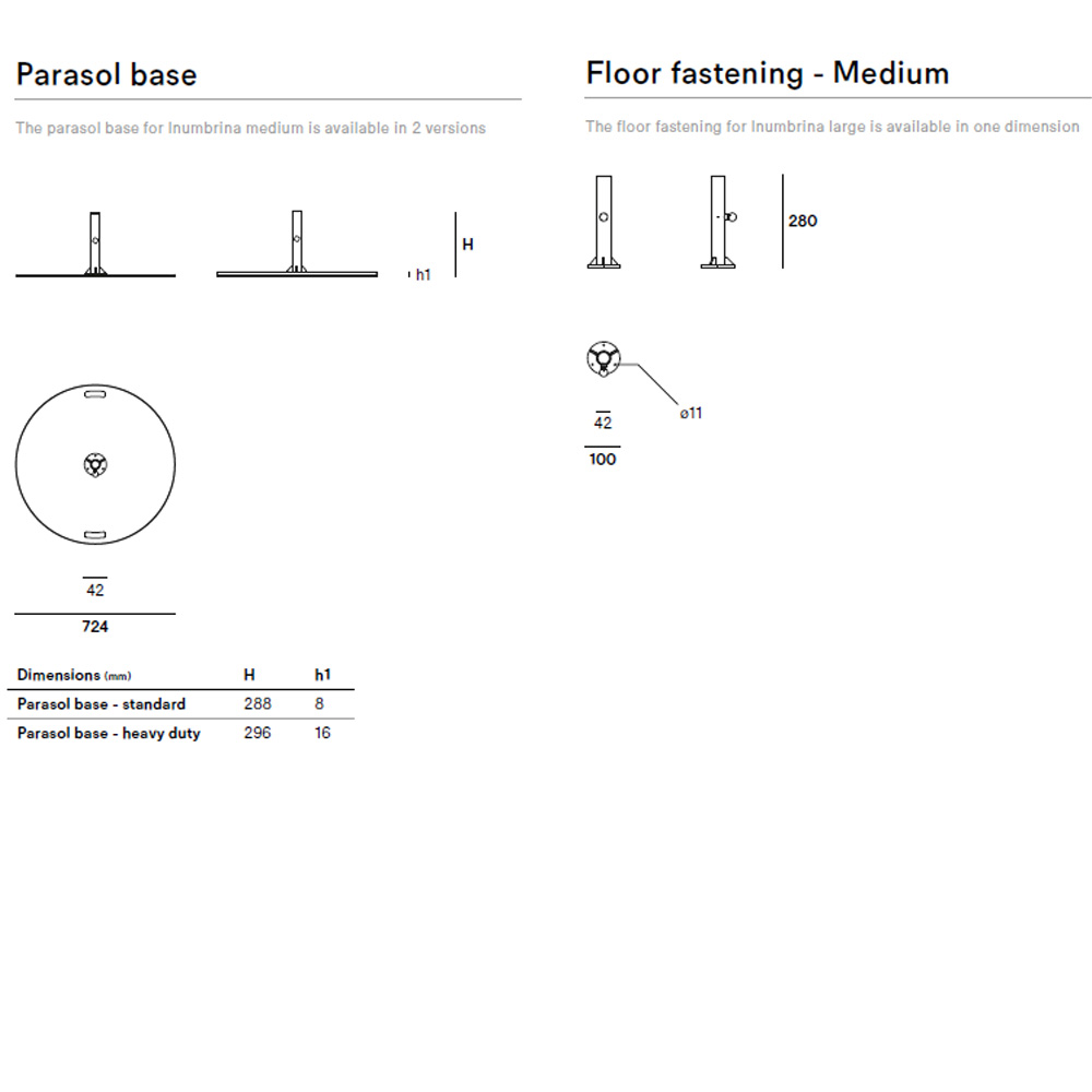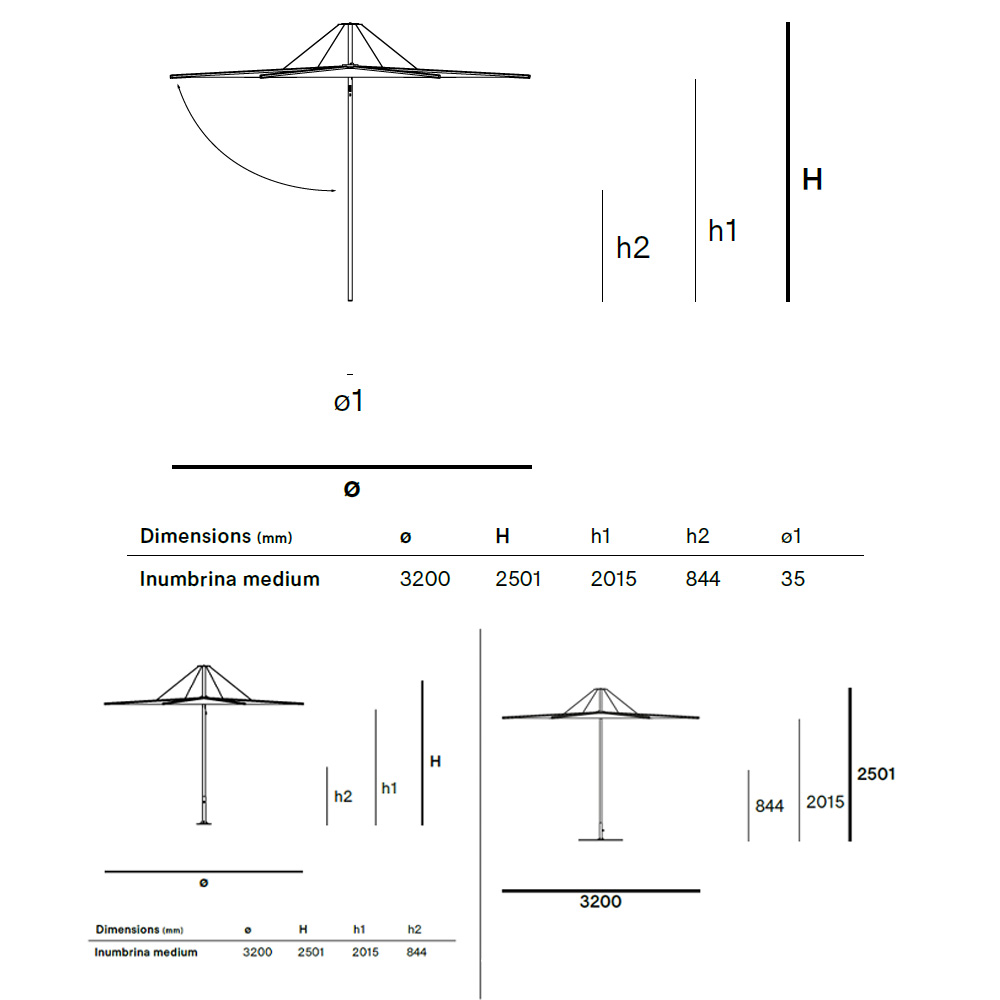 Una maravilla ligera. ¿La lección que aprendimos del éxito de Inumbra como fabricante de parasoles? Hay búsqueda de una innovación que sea fácil de ver. La demanda de una versión más ligera de un parasol nos hizo desarrollar Inumbrina (una Inumbra pequeña). Dotada de las mismas ventajas que su predecesora de mayor tamaño: una hermosa simplicidad, una elegancia simple y una tremenda resistencia al viento gracias a su diseño plano.