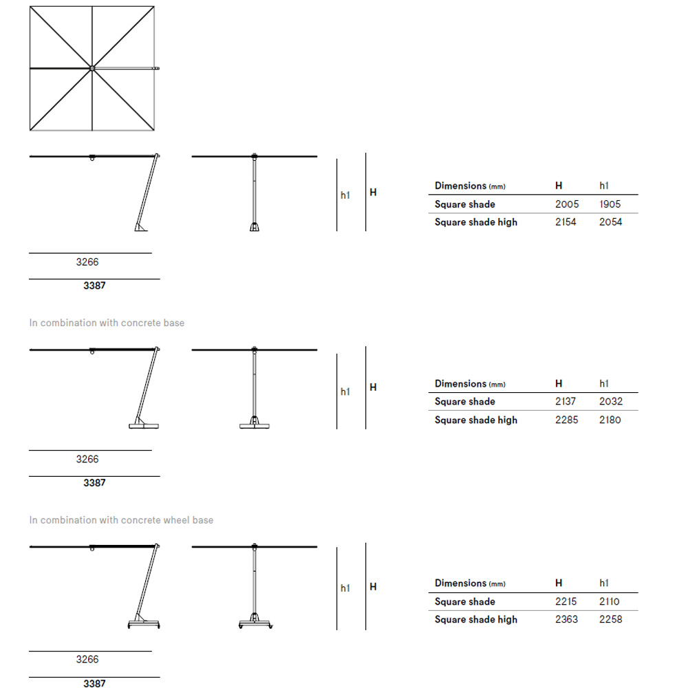 Parasol exterior cuadrado con apertura estilo abanico. Diseño Dirk Wynants.
