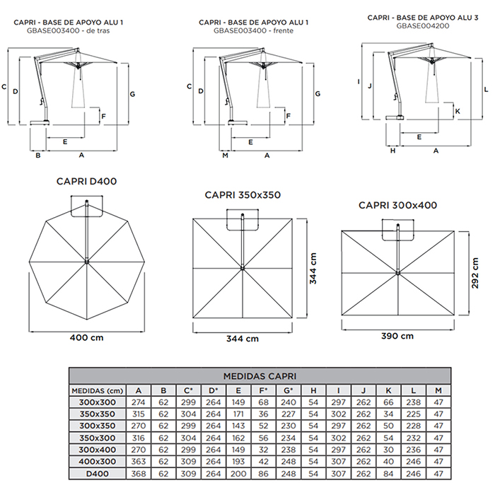 Sombrilla Capri con mástil lateral realizado en aluminio.