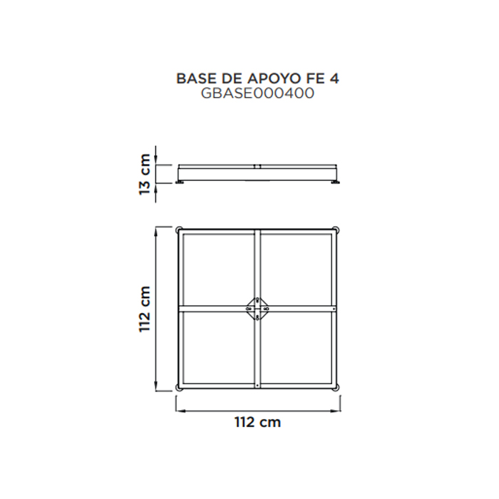 • Base de apoyo FE 4:Base cuadrada en acero barnizadoen mismo color de la estructura. Precisa 16 baldosa de cemento de 50x50x4 cm. (incluidas en el precio)