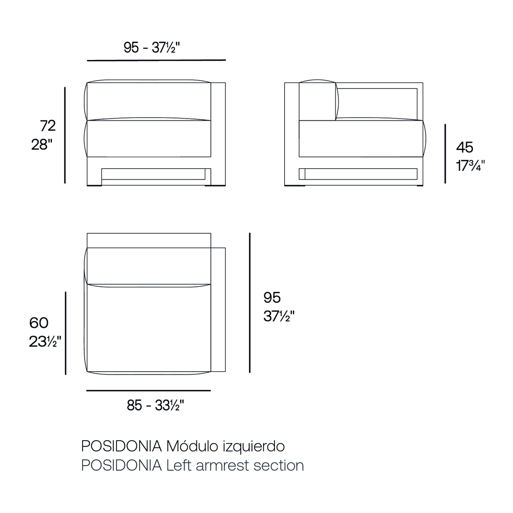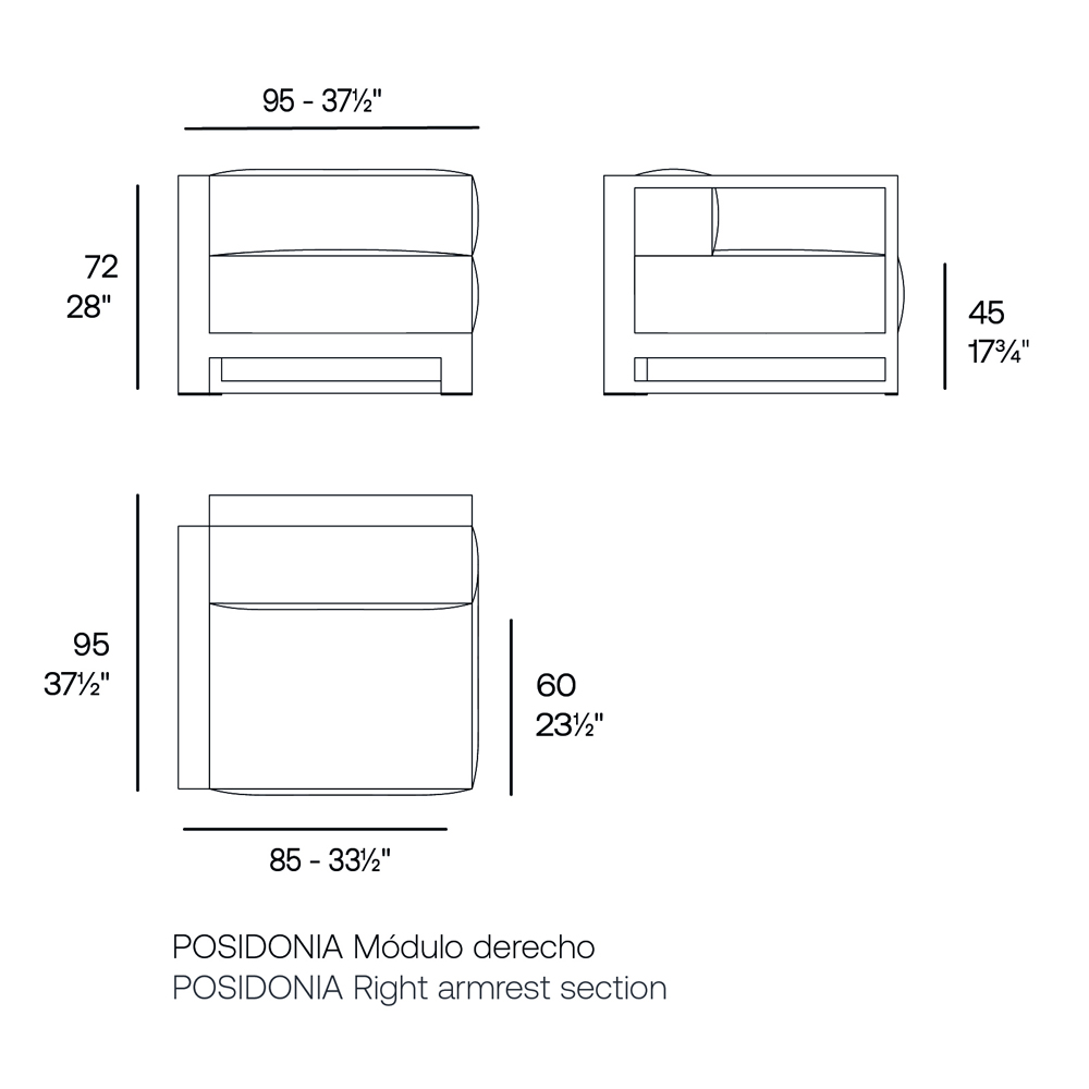 Módulo brazo tapizado con estructura de aluminio. Dimensiones: 95x95x72h cm.
