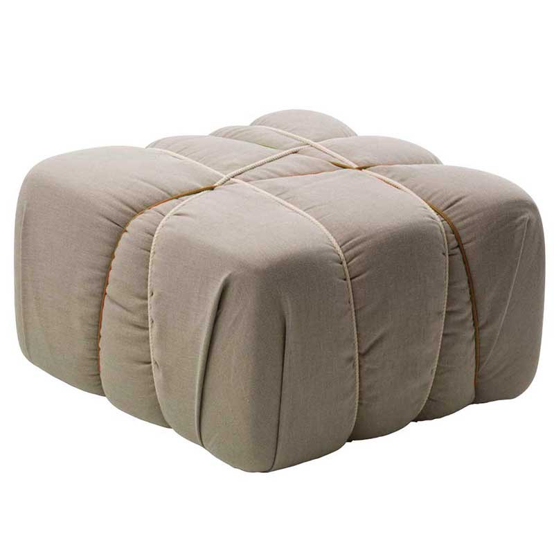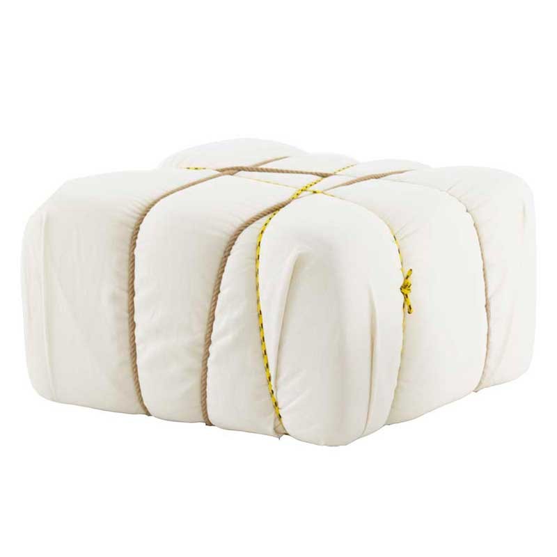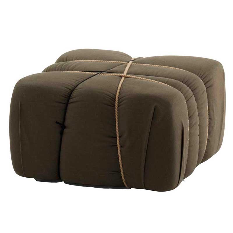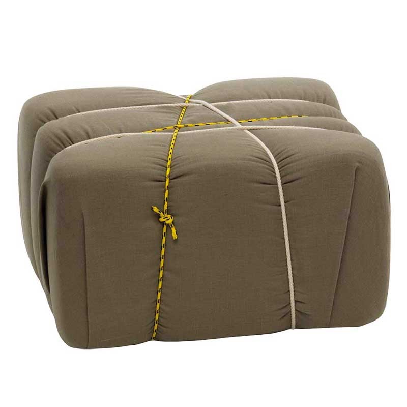 Che Pakko es un puf moderno inspirado en los paquetes para enviar, encerrados y atados con cuerdas.