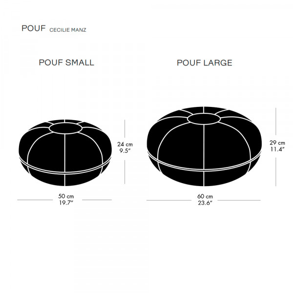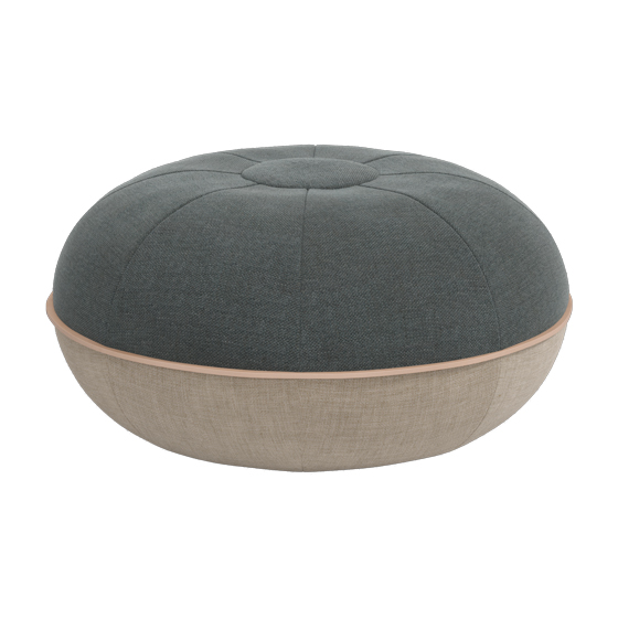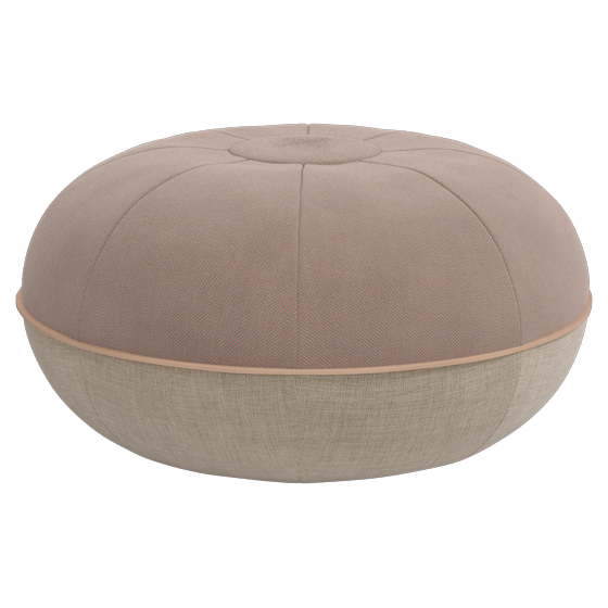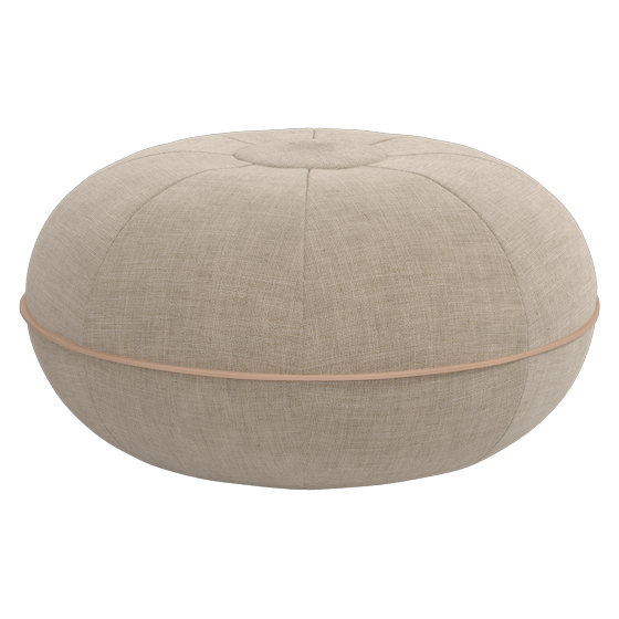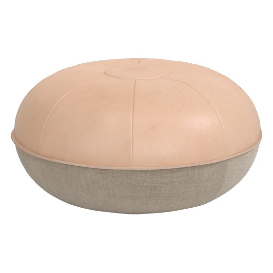 Pouf redondo tapizado con ribetes de cuero. Diseñado por Cecilia Manz