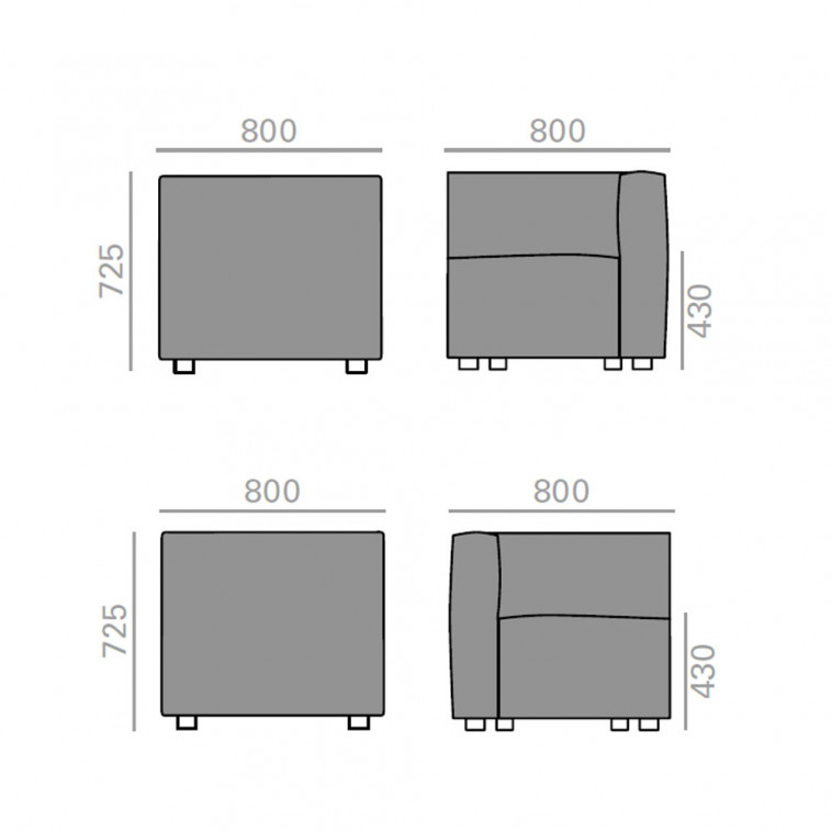 Módulo de sofá esquinero tapizado con un brazo. Dmensiones: 80x80x72,5h cm.