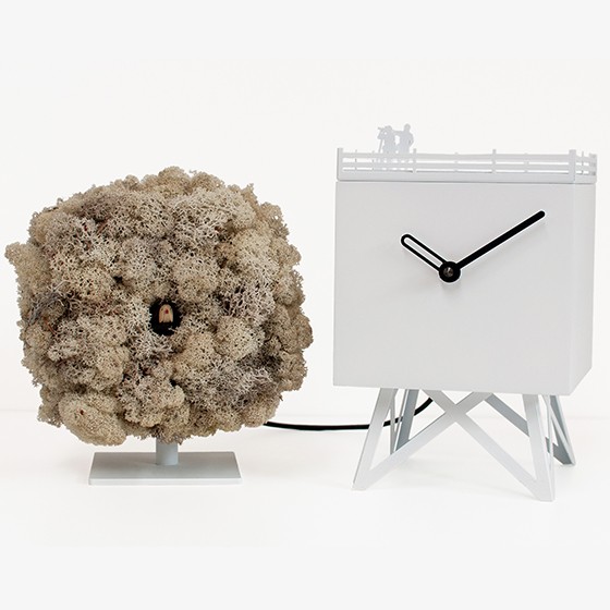 Reloj cucú de sobremesa en madera y líquenes. Dimensiones: 15x15x27h cm.