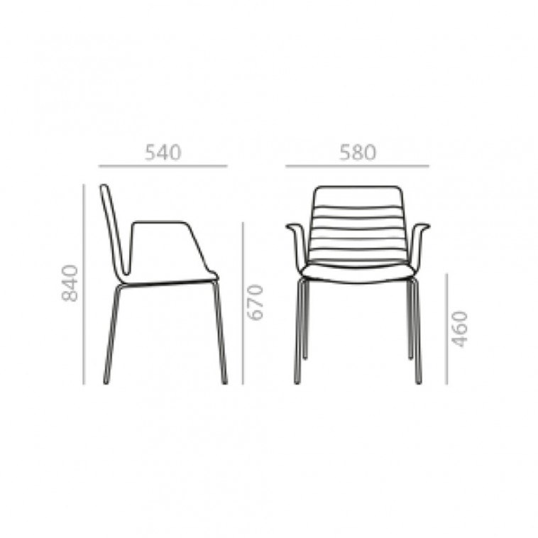 Silla con brazos carcasa tapizada en base de 4 patas de tubo de acero.