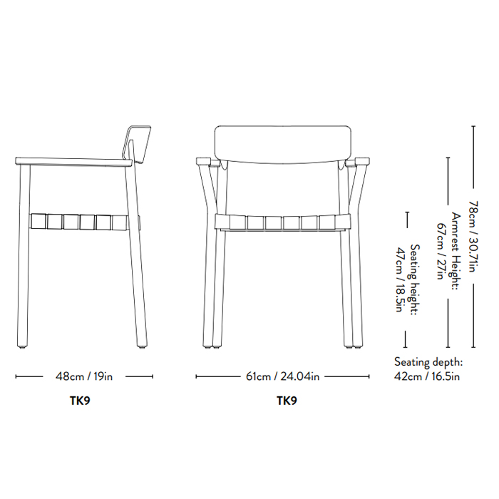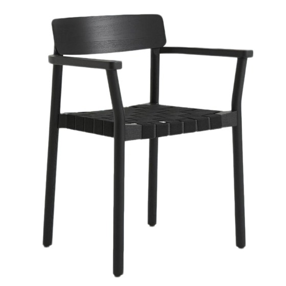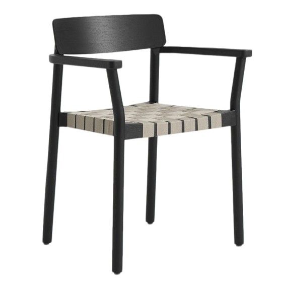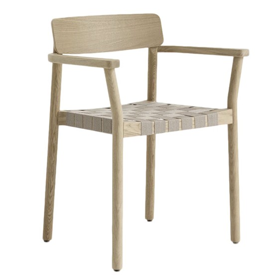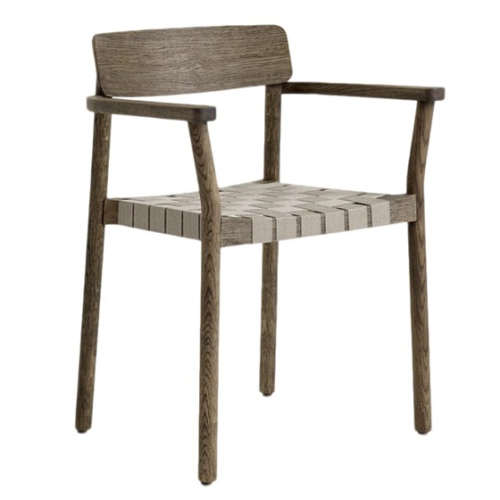 Silla con brazos de madera y asiento de correas de lino. Dimensiones: 61x48x78h cm.