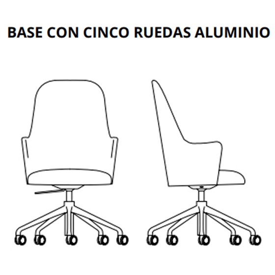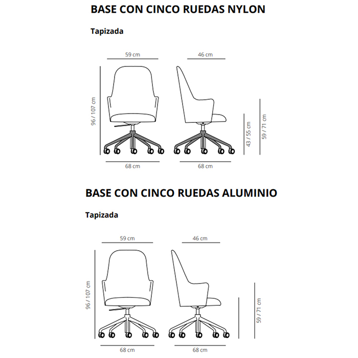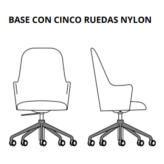 • Cinco ruedas nylon regulable en altura: Base giratoria de nylon en color negro. Regulación en altura por gas y ruedas de rodadura blanda en blanco o negro. Disponible con mecanismo basculante.