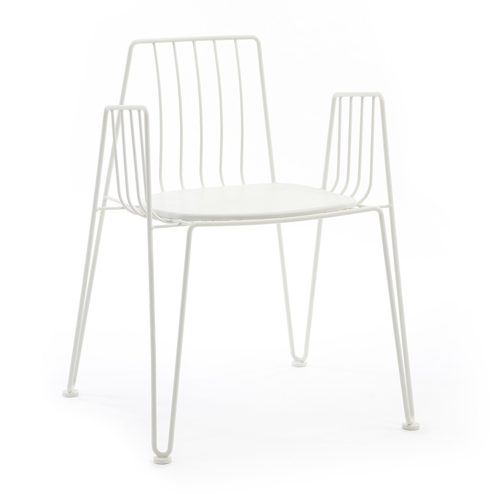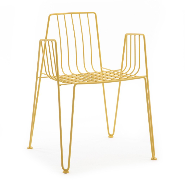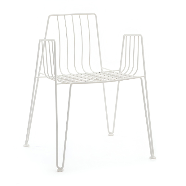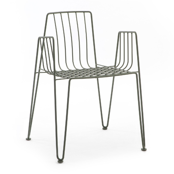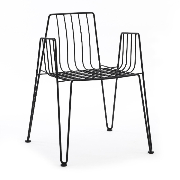 Rambla es una silla con brazos fabricada con varilla de acero, apilable y ligera. Formalmente contemporánea, reinterpreta la tradición y el estilo de vida del Mediterráneo más cosmopolita. Cómoda y de medidas generosas, con brazos para poder descansar y un cojín opcional de espuma de poliuretano, es una silla apta para exteriores y, por su modernidad y diseño, también idónea para espacios de la casa como comedores, cocinas, porches o terrazas.