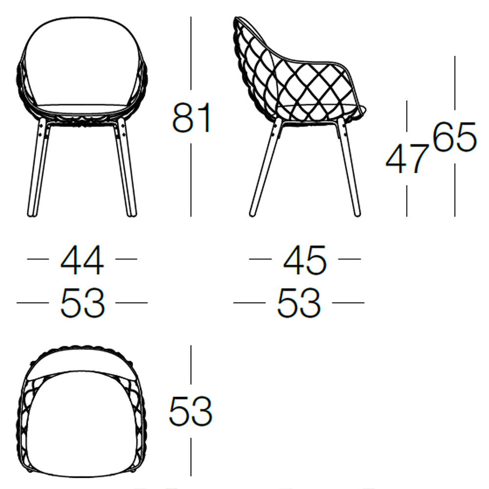 Silla tapizada con carcasa de acero y patas de fresno. Dimensiones: 53x53x81h cm.
