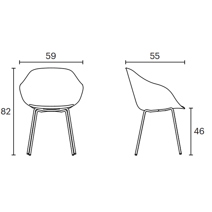 Silla tapizada de 4 patas de acero laminado o cromado. Dimensiones: 59x55x82h cm.