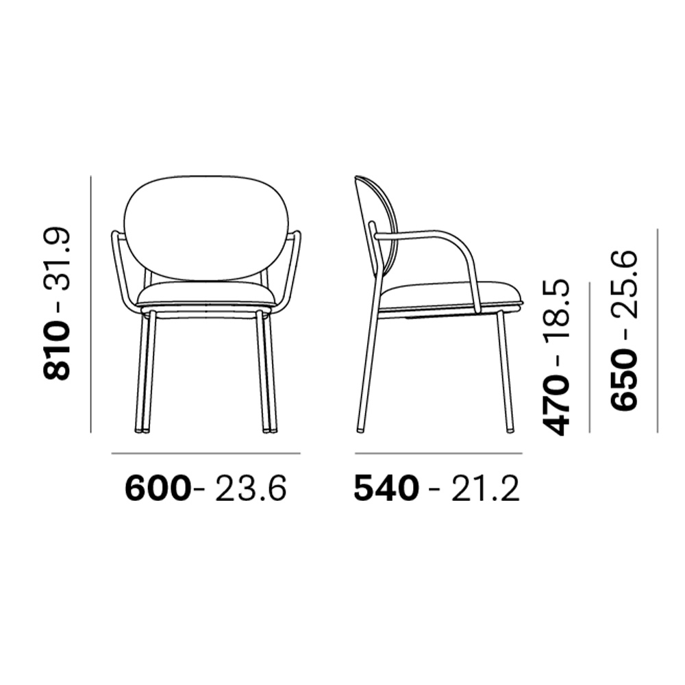Caracterizada por formas suaves y redondeadas, la silla Stiel tiene una estructura de tubular de acero con curvas sinuosas y un relleno de espuma de poliuretano suave y generoso.