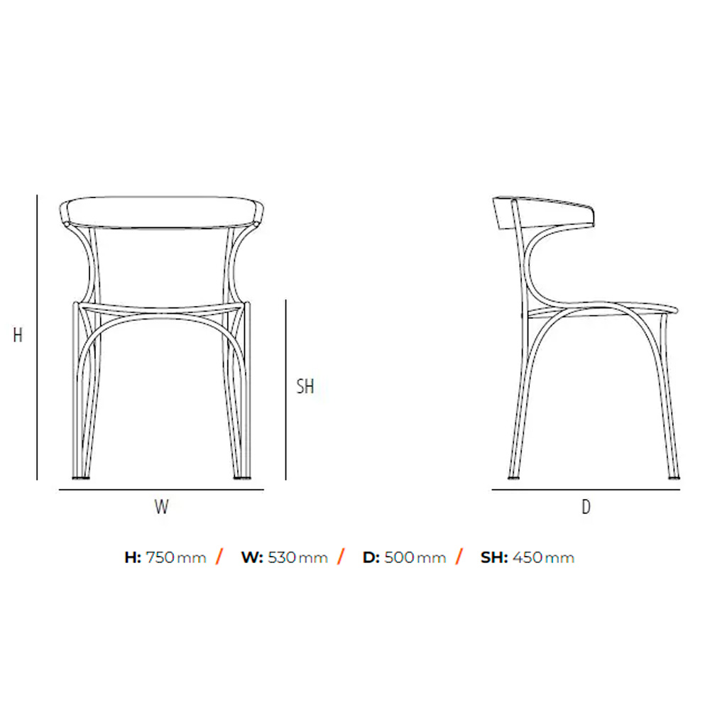 Silla con asiento y respaldo de fresno y estructura de metal. Dimensiones: 53x50x75h cm.